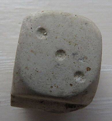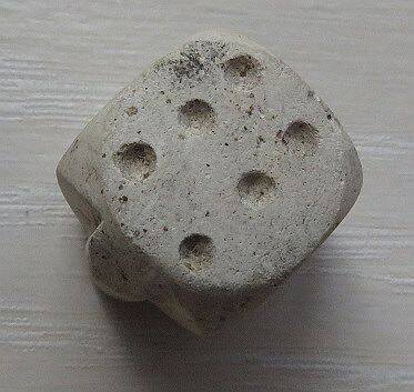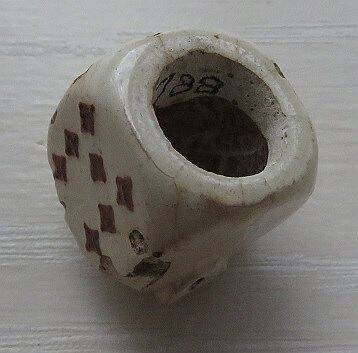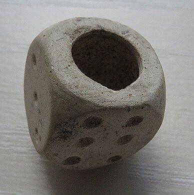 Kleipijp (lade1FM788A) in de vorm van een dobbelsteen met afbeeldingen van de de nummers 4, 3, 5 en 1.