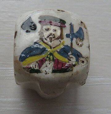 Kleipijp (lade1FM788B) in de vorm van een kaartspel met afbeeldingen van de kaarten harten zes, schoppenboer en ruiten zes.