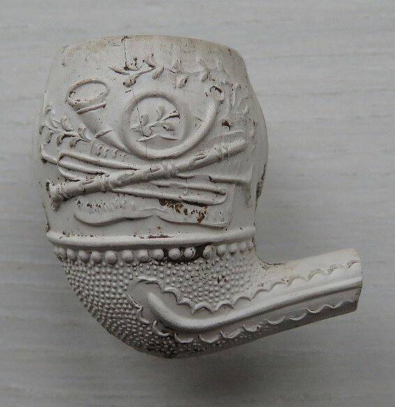 Kleipijp (DsPR1FM011) met aan twee kanten muziekinstrumenten. Eind 19e eeuw.