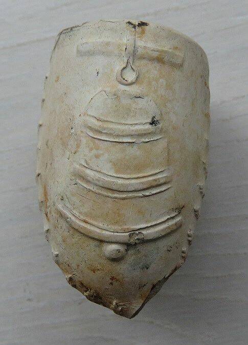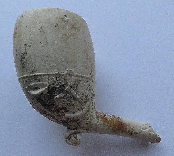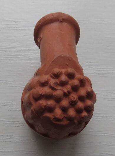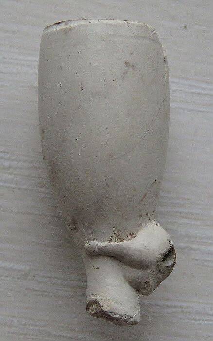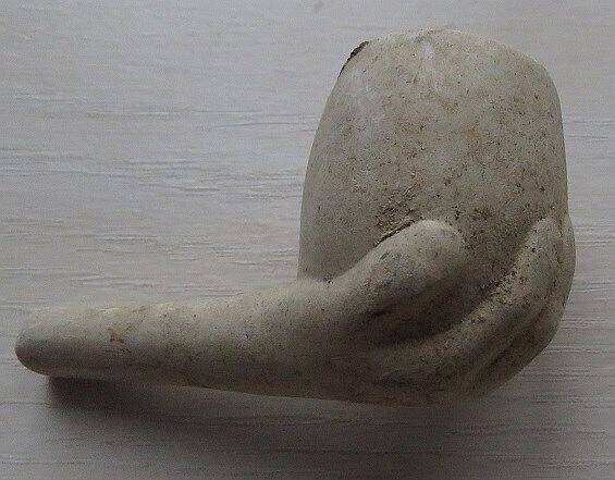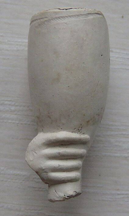 Kleipijp (Lade17FM001) Gegoten pijp van bisquit nog ongeglazuurd met een hand die een drinkbeker vasthoudt.
