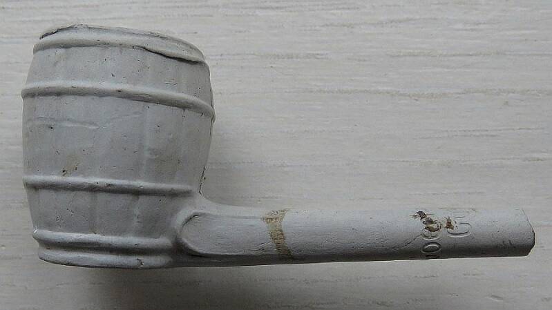 Kleipijp (lade13FM207) met een ton. Omstreeks 1880. Op de steel de naam van de Goudse pijpenmaker