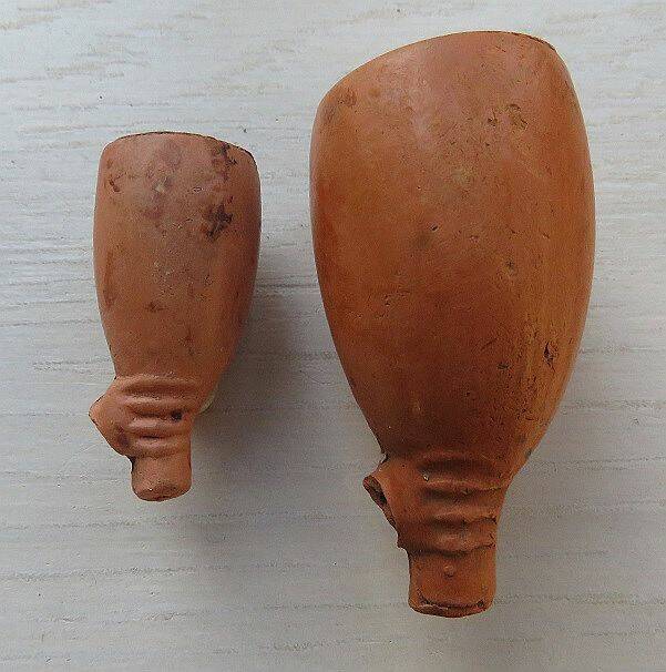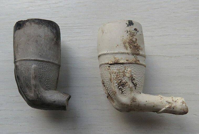 Kleipijpen (lade37FM007) (groot en klein exemplaar) met een hand die een drinkbeker vasthoudt. Gouda. Eind 19e eeuw.