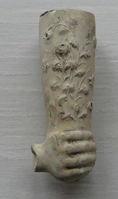 Kleipijp (lade18FM1241) type sigaretten/sigaarpijpje met een hand die een drinkbeker vasthoudt. Eind 19e eeuw.