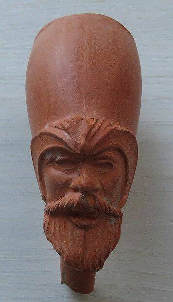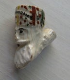 Geglazuurde kleipijp (dS20FM30) in de vorm van het gezicht wat lijkt op een Dajakse krijger. 1e kwart 20e eeuw.
