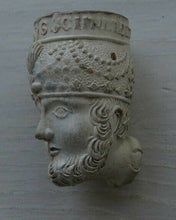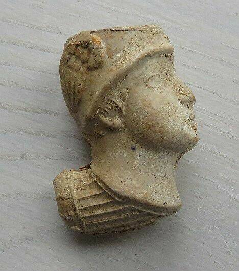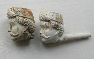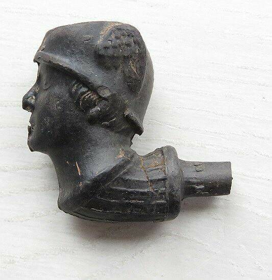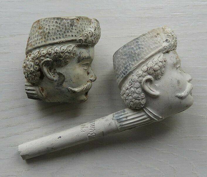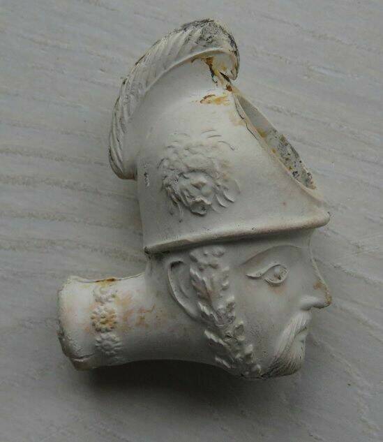 Kleipijp (Ds20FM15) Twee Gezichtspijpen met de voorstelling van een Romeinse soldaat met helm en daarop leeuwenkopjes. Het sigarettenpijpje met de