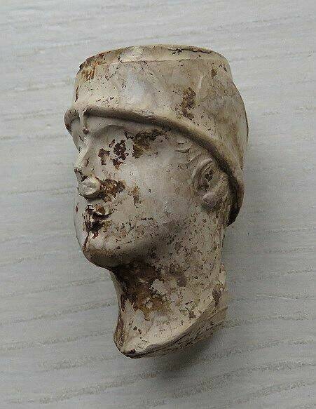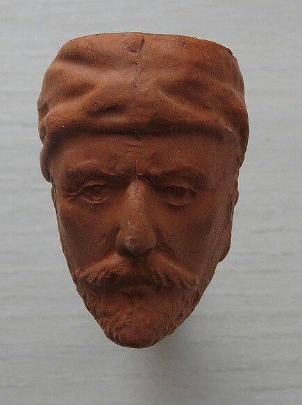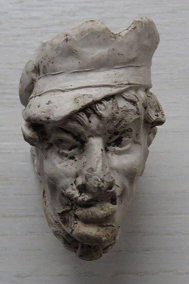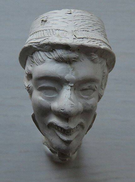 Kleipijp (lade20FM10) Figuraal gezichtspijp man met hoed. 1975. Gemaakt uit persvorm van Goedewaagen door Peter Predgett.