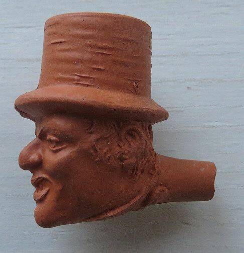 Kleipijp (Lade57FM102) Figuraal met het gezicht van een man met hoedje op. Gouda. 2e helft 19e eeuw. Merk: geen.