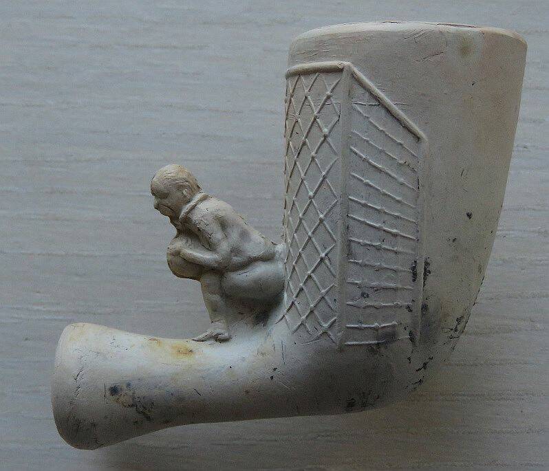 Kleipijp (lade21FM1619) manchettype met een man met bal (keeper) zittend voor het doel. Fabriek: P. Goedewaagen. Omstreeks 1900.Vindplaats: Gouda Jaagpad bij voormalige fabriek Goedewaagen.