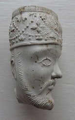 Kleipijpen (lade21FM) met het gezicht van de Koning van Afrikaans Congo in wit en rood. Fabriek: P. Goedewaagen.