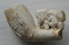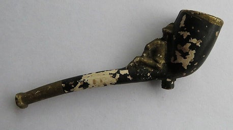 symbolisch de Atlas met de wereldbol vasthoudt. De pijp heeft een klein gaatje van de wijer die verkeerd is ingestoken bij het maken