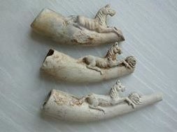 Sigaretten/sigaarpijpjes (part verz) in de vorm van een hoorn met een leeuw. Ca. 1880. Pijpenmaker: Firma P. van der Want Gzn. Vindplaats: Gouda/polder Achterwillens.