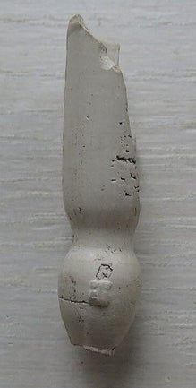 19e eeuw. Vindplaats: Gouda Drapiersteeg. B. van der Maas. De complete kleipijp heeft een steel van ca. 30 cm.