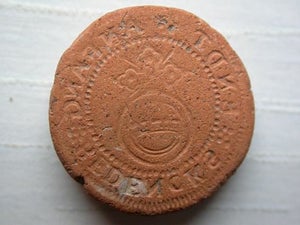 Grospenning (lade23FM) van een muntafdruk gemaakt uit rode klei. 1e helft 18e eeuw. Gouda. Bodemvondst Gouda polder Achterwillens.