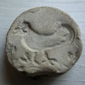 Grospenning ((FM >> Amsterdam Pipe Museum) gemaakt door het indrukken van een zegelring in een plakje pijpenklei. Dit is maar aan een kant gedaan. Diameter is 22 mm. Gouda. 1740 - 1840.
