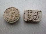 Vijf grospenningen (lade23FM) waarop aan twee kanten de afdrukken van ketelopeningen van kleipijpen staan ingedrukt. De opening van de ketels heeft een diameter welke vrijwel gelijk is aan laat 17e of wellicht vroeg 18e eeuwse kleipijpen. Makers onbekend.