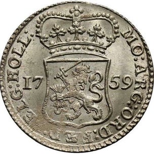 op de keerzijde van 1/4 zilveren Gulden. Hollandse Leeuw met zwaard en pijlenbundel. Jaartal 1759 / Nederlandse maagd met speer