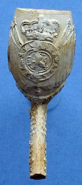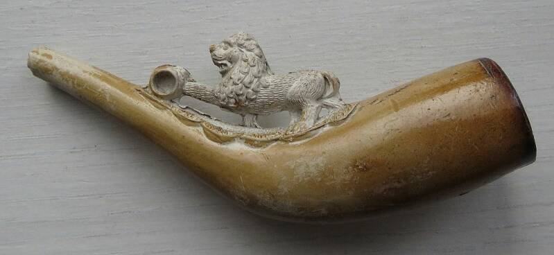 Kleipijp (lade37FM002) met afbeelding van een leeuw met zijn poot op een wereldbol, in dit geval met een kijkglaasje. De pijp symboliseert de zege van Oranje uit de tijd van de slag bij Waterloo. Vermoedelijke maker P. van der Want.