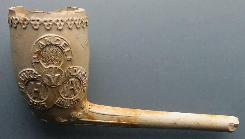 Kleipijp (AK) met Drie circels met de letters HVA en Tekst: H v ANDELs TABAKS INDUSTRIE DELFT HOLLAND. Het gaat hier om Reclamepijp van de Tabaksindustrie Andels te Delft.
