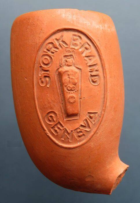 Kleipijp (AK) In medaillon Jeneverfles met de tekst STORK BRAND GENEVA / STORK BRAND GENEVA.