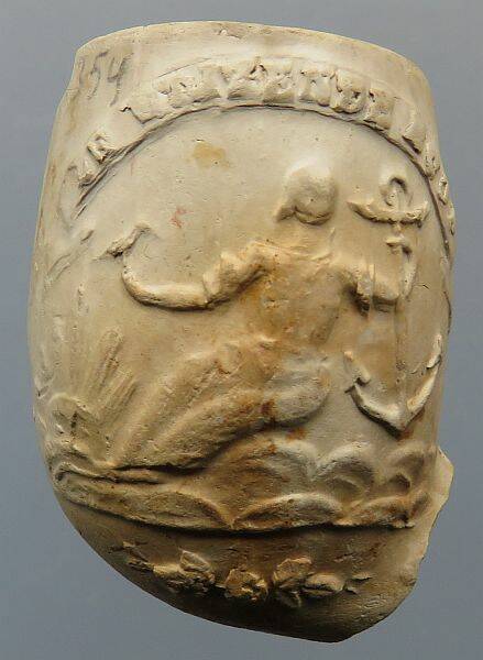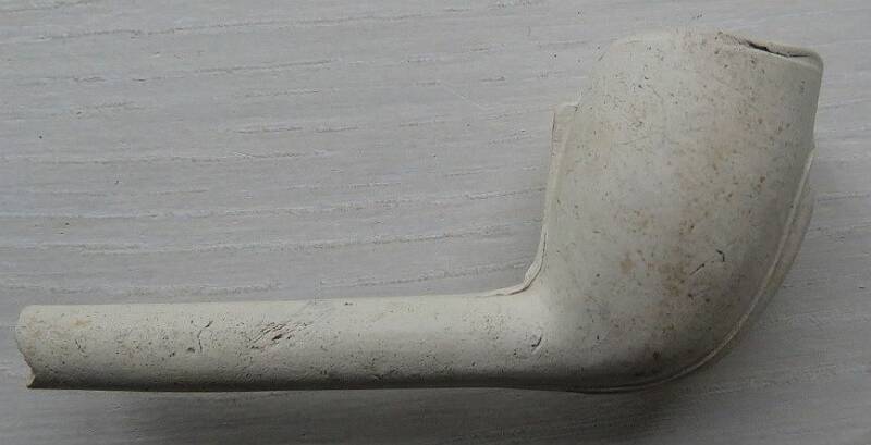 Kleipijp (Lade17FM54) Reclamepijp met De Hoop met anker en duif / Tabakston en Theebussen en andere verpakkingen, Karotten op de voorgrond.