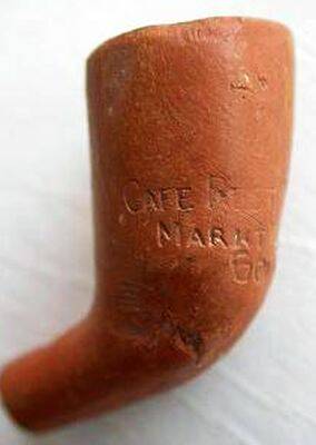 Kleipijp (part verz) sigarettenpijpje Tekst: Café Rest De Harmonie Markt De Waag Gouda. Omstreeks 1900. Pijpenmaker: Firma P.J. van der Want Zn. Vindplaats: Gouda polder Achterwillens in een pijpenafvalstort van deze fabriek.