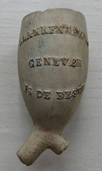Kleipijp (lade22FM1016) met BLANKENHEYMS GENEVER IS DE BESTE / BLANKENHEYMS GENEVER IS DE BESTE . 1870-1900. Hielmerk GN gekroond. Frans Simon Sparnaay.