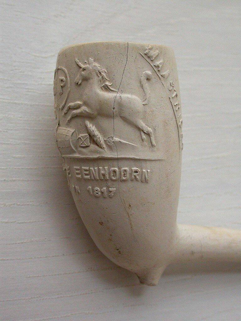 Kleipijp (part verz) met DE DUBBELE EENHOORN met Tabakston, tabaksrol en verpakkingen en medaillon