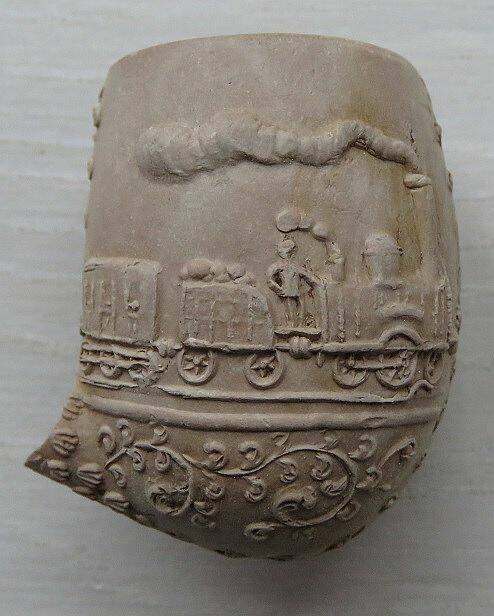 Bodemvondst uit Noord-Holland, een porseleinen pijpenkop met de afbeelding van een stoomtrein. Waarschijnlijk Duits en vervaardigd aan het midden/eind van de 19e eeuw.