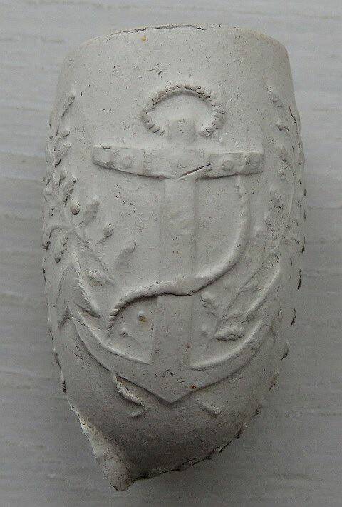 Mooie scherpe kleipijp (lade38FM028)met Anker aan twee kanten. Hielmerk: Geen. Pijpenmaker: P. van der Want of Frans Simon Sparnaaij.