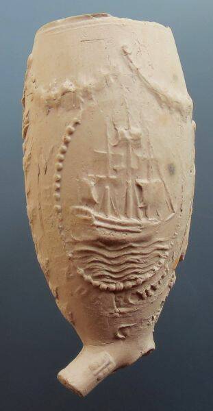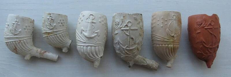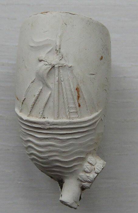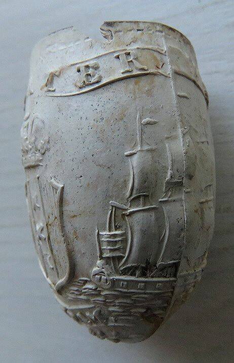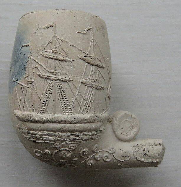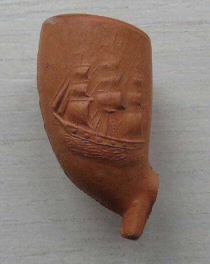 Kleipijp (Lade17FM1207) met zeilschip. 1860-1880. Aan de andere kant de voorstelling van een anker. Dit soort kleipijpen werd speciaal voor zeelui en schippers vervaardigd.