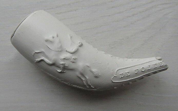 Kleipijp (DsPR1FM021) met hoornpijp) met aan een kant een ruiter met posthoorn en de tekst DE POSTELJON. Aan de andere kant een koets met paarden en de tekst POSTWAGEN. Datering: ca.1880. Goudse productie, vermoedelijk van Duijn.