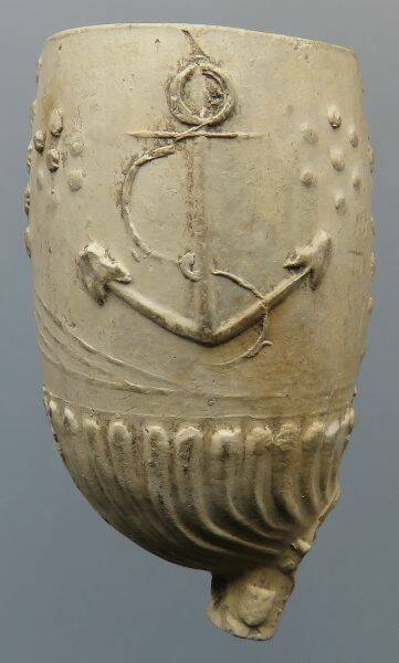 Kleipijp (Lade13FM) met zeilschip. 1860-1880. Aan de andere kant de voorstelling van een anker. Dit soort kleipijpen werd speciaal voor zeelui en schippers vervaardigd.