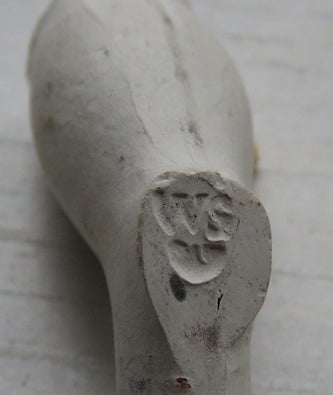 Op de steel van de twee onderstaande kleipijpen staan gestempelde merken. De manier waarop dat is uitgevoerd is zeldzaam.