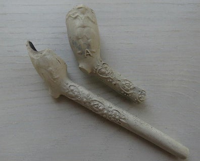Kleipijpjes(HB) met aan twee kanten leeuwenkopjes. Ca. 1620-1640.