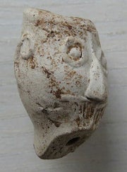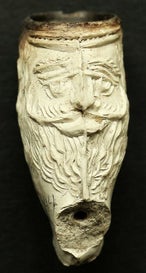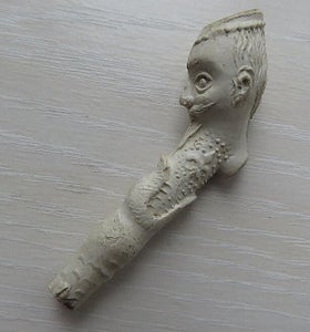 Jonaspijpje met een primitief gezicht. Ca. 1640-1670. Gouds product. Bodemvondst omgeving Gouda.
