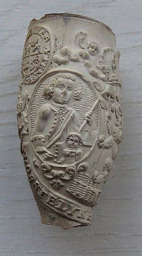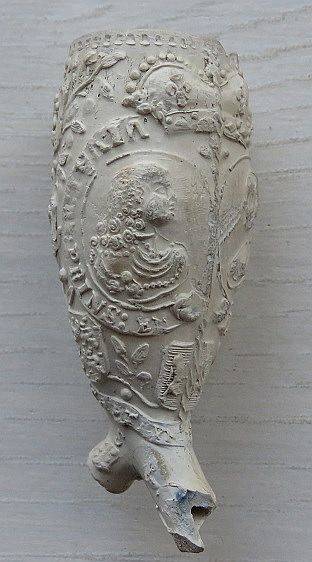 Kleipijpen van ca. 1672 met de voorstelling van het Portret Stadhouder Willem III, Tekst: VIVAT ORANGIEN / Ander kant pijp het Stadhouderlijk wapen. Tekst op de naad: WILHELMUS P. DORANGE. Op de steel Slingerende bladranken met oranjeappeltjes. Gouda. Pijpenmaker: onbekend