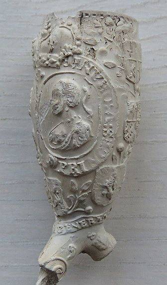18e eeuwse ORANJE kleipijp (Ds22FM21) met medaillons met portretten van Stadhouder Willem IV en zijn vrouw Prinses