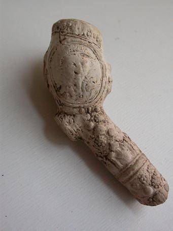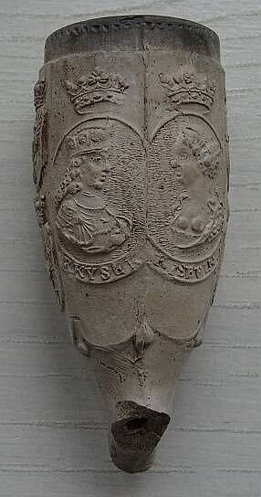 Kleipijp ORANJEpijpjes (part. verz) met de voorstelling van portretten van Amalia van Solms (links) en Frederik Hendrik( rechts). Kleipijpjes zijn waarschijnlijk uitgebracht bij hun huwelijk. Omstreeks 1625. Bodemvondsten Reeuwijk in een pijpenstort van barokpijpjes.