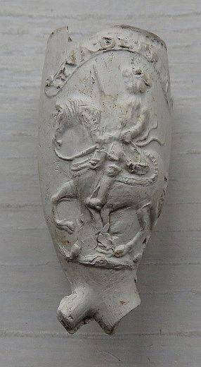 Kleipijp (Ds33FMgeen nummer) van ca. 1670 met dezelfde afbeelding als hierboven. Ook weer met de voorstelling van de prins te paard en aan de andere kant met Stadhouderlijke wapens. Met een fraai stukje steel. Vindplaats: onbekend