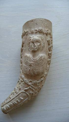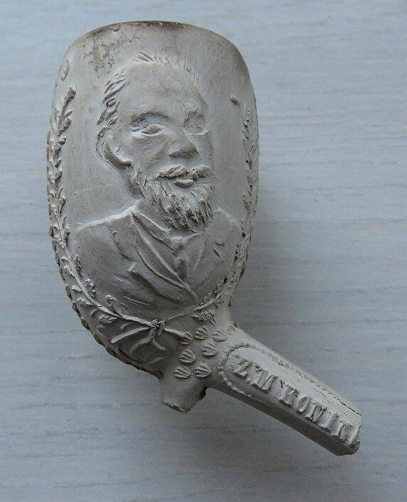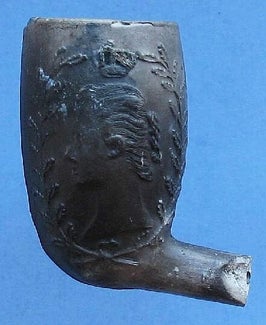 Hoornpijpen met de afbeelding van Koning Willem III in een ovaal. Boven het borstbeeld staat de tekst