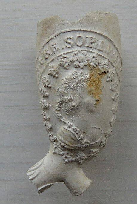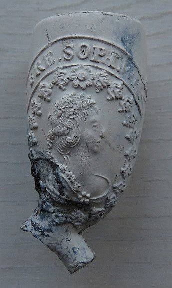 18e eeuwse Oranjepijp (Ds33FM357) met de portretten van Willem V en Prinses Sophia. In een lint de tekst: WILLEM.V.P.V.O en FRE.SOPH.WIL. In Gorkum vervaardigd. Merk IVE van de pijpmaker Jan van Erp. Vindplaats: Zevenhuizen