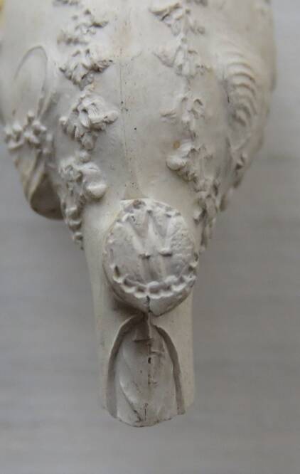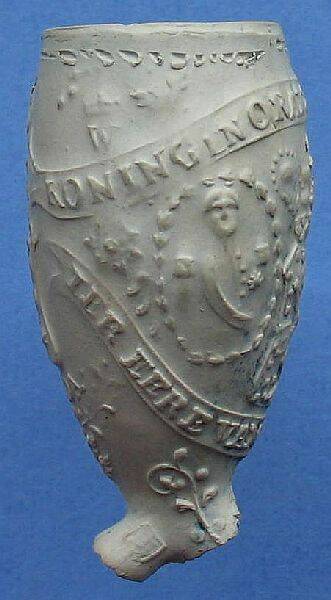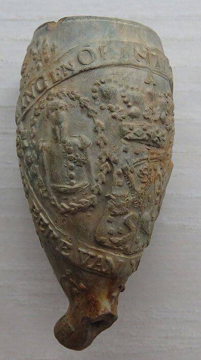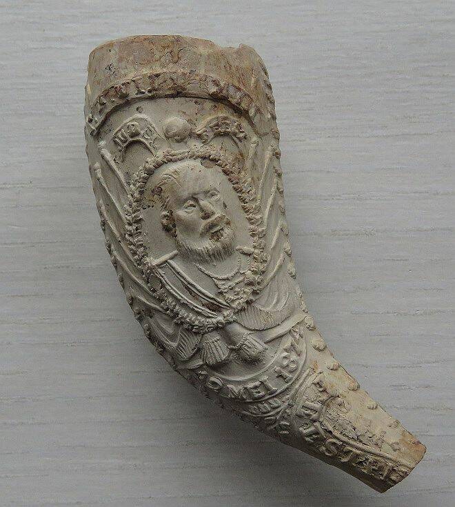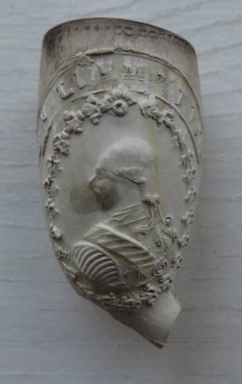 Kleipijp (lade11FM009) met het portret van Willem van Oranje. Op de steel van deze hoornpijp staat een deel van een tekst.