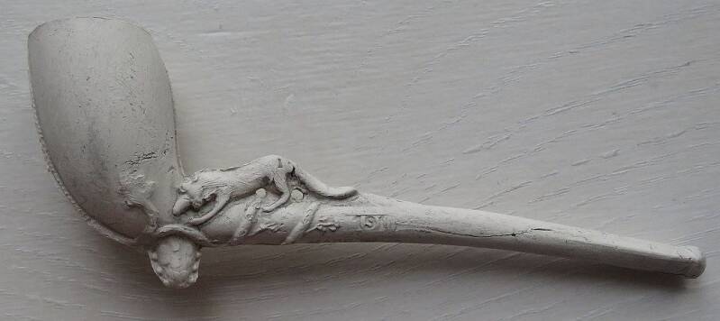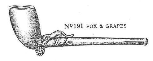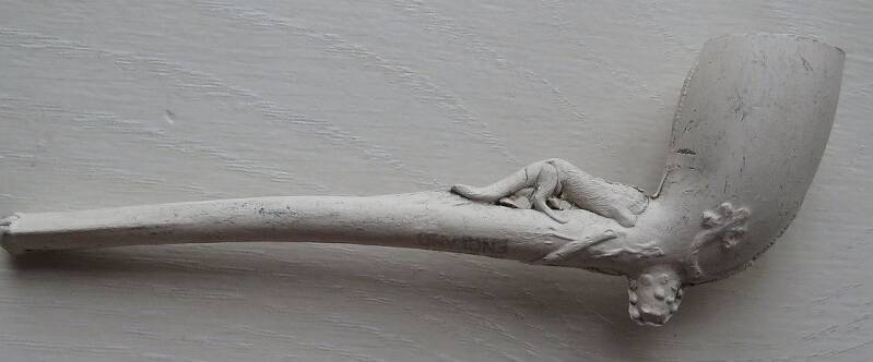 Kleipijp (Lade25FM52) Figuraal met op de steel een liggende vos en druivenranken. Engeland. Midden 20e eeuw.