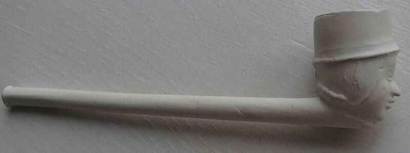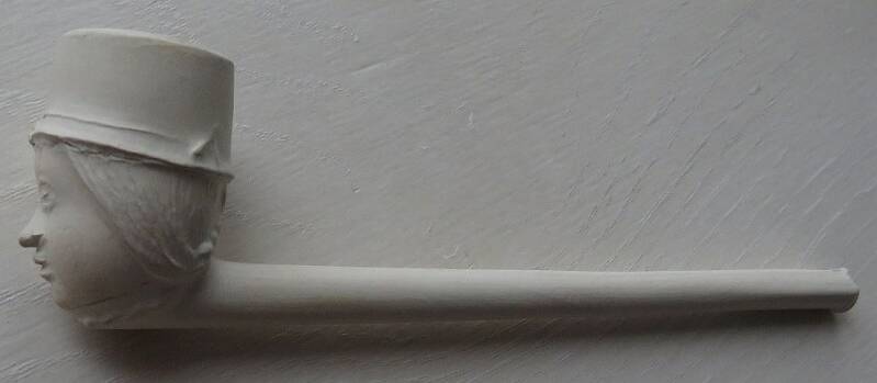 Kleipijp (Lade33FM48) figuraal met het gezicht van Koningin Victoria van Engeland. Ca. midden 20e eeuw. Engeland.