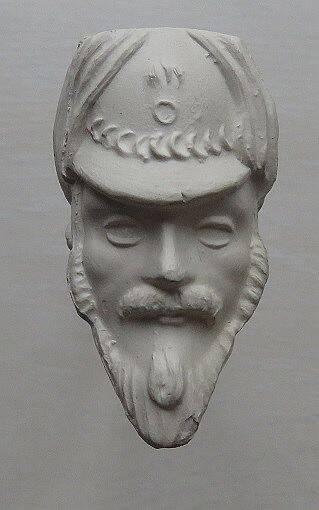 Kleipijp (Lade33FM52) figuraal met een man met snor, baardje en open geklapt vizier. Pijp geschilderd. 3e kwart 20e eeuw. Pijpenmaker: Trumm-Bergmans Weert. Remake Fred Tijmstra Volendam. Beschilderd en geglazuurd door Ceciel Landuijt