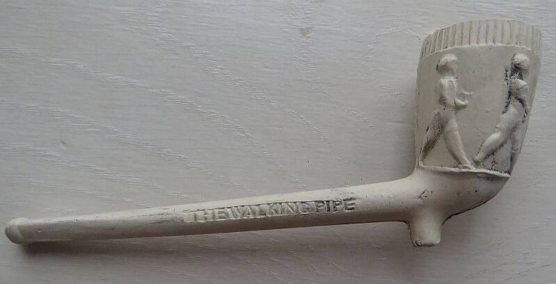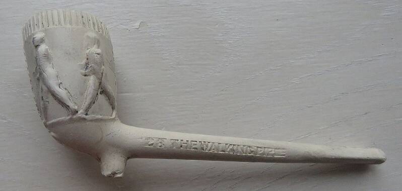 Kleipijp (Lade25FM34) met de afbeelding van twee wandelaars. Op de steel aan twee kanten de tekst: THE WALKING PIPE.