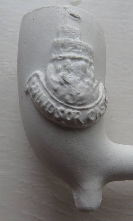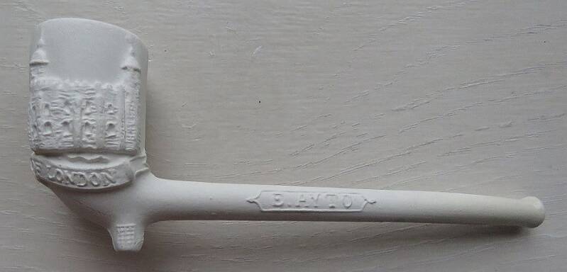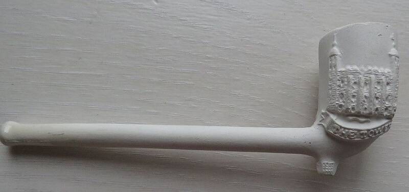 Kleipijp (Lade25FM37) Figuraal met de voorstelling van WINDSOR CASTLE. Op de steel naam pijpenmaker. Engeland West Sussex Bramber.