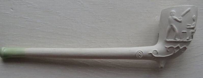 Kleipijp (Lade25FM39) Figuraal met twee cricketspelers bij de wicket, slagbal. Engeland. Midden 20e eeuw. Pijpenfabriek: Eric G. Ayto