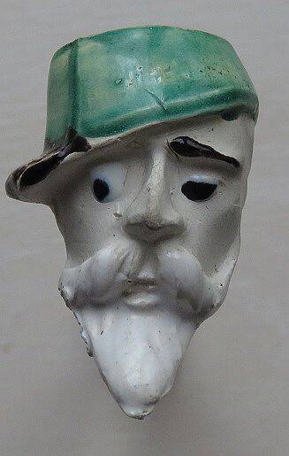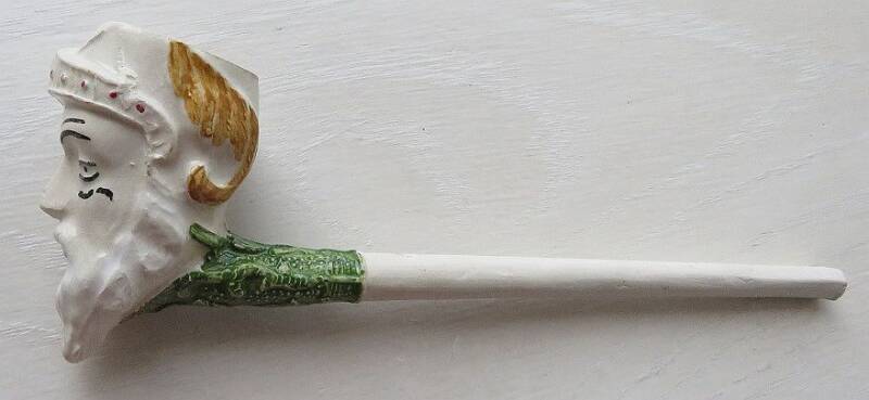 Kleipijp (Lade25FM43) Figuraal met het gezicht van een man met snor en sik en groene pet op. Frankrijk.