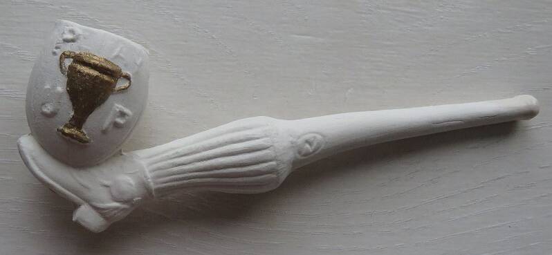 Kleipijp (Lade25FM54) Figuraal met voetbalschoen en de beker. Rondom de beker letters PUP en AY ? Engeland.
